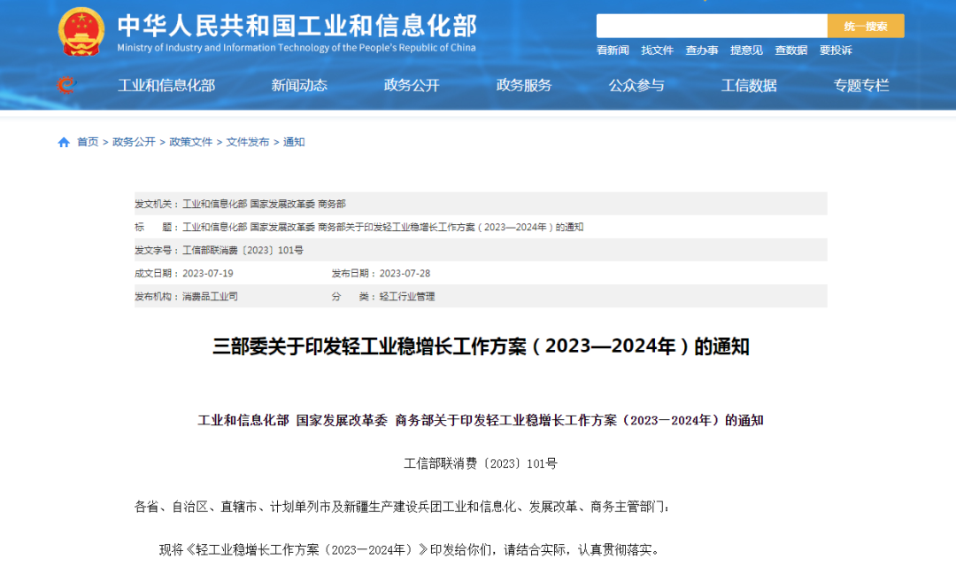 工信部、国家发展改革委、商务部近日联合印发《轻工业稳增长工作方案(2023—2024年)》(工信部联消费﹝2023﹞101号,以下简称《工作方案》)